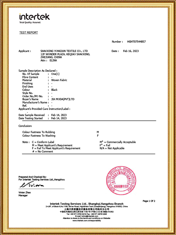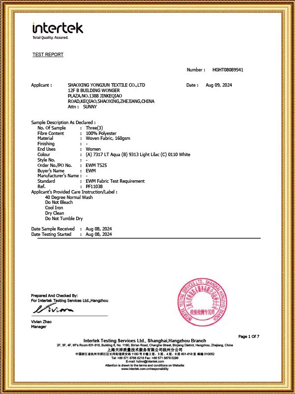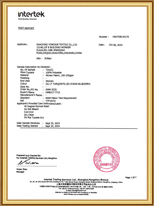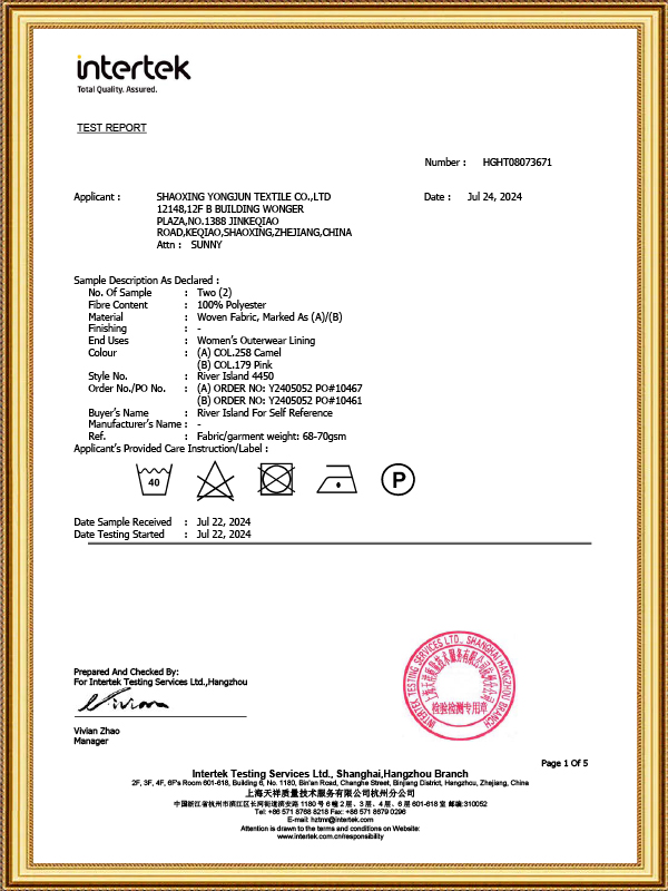 Yongjun Textile, der blev grundlagt i 2003 og placeret i China Light Textile City – et af Asiens store lette tekstilmarkeder – støder op til Hangzhou Xiaoshan International Airport, med bekvem transport og veludviklet kommunikation. Virksomheden har uafhængige import- og eksportrettigheder og har specialiseret sig i at producere og sælge en bred vifte af vævede og strikkede foringer, herunder jacquard, almindelig, twill, satin og andre farvede foringer samt foringer, der er behandlet gennem forskellige teknikker som garnfarvning, prægning, glasering, udskrivning, udbrænding, belægning, varmstempling. De vigtigste materialer, der anvendes i produkterne, er polyester, polyester-bomuld, bomuld, rayon, nylon, acetat osv. Siden etableringen har virksomheden konsekvent fulgt forretningsfilosofien om "at stræbe efter høje standarder (kontinuerlig forbedring og raffinering), nøjagtighed (klar og præcis), hastighed (hurtigt opfylder og lever op til kundernes behov og innovation), produkter og tjenester af høj kvalitet.